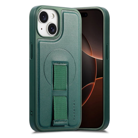 iPhone 15 - Hårdt Plastik Cover m. Kunstlæder Bagside & Fingerrem - MagSafe Kompatibel - Grøn