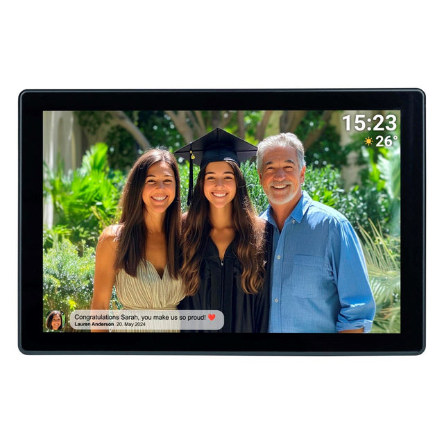 Med Frameo-appen kan du sende fotos og videoer direkte fra din smartphone, tilpasse billedtekster, administrere venner og planlægge fotorotation. Timerfunktionen slukker rammen automatisk om natten.