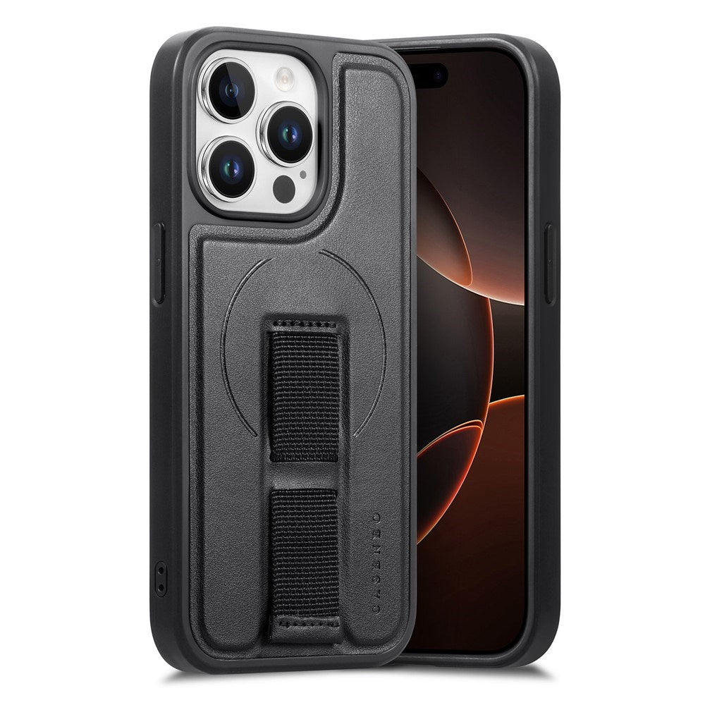 iPhone 13 Pro - Hårdt Plastik Cover m. Kunstlæder Bagside & Fingerrem - MagSafe Kompatibel - Sort