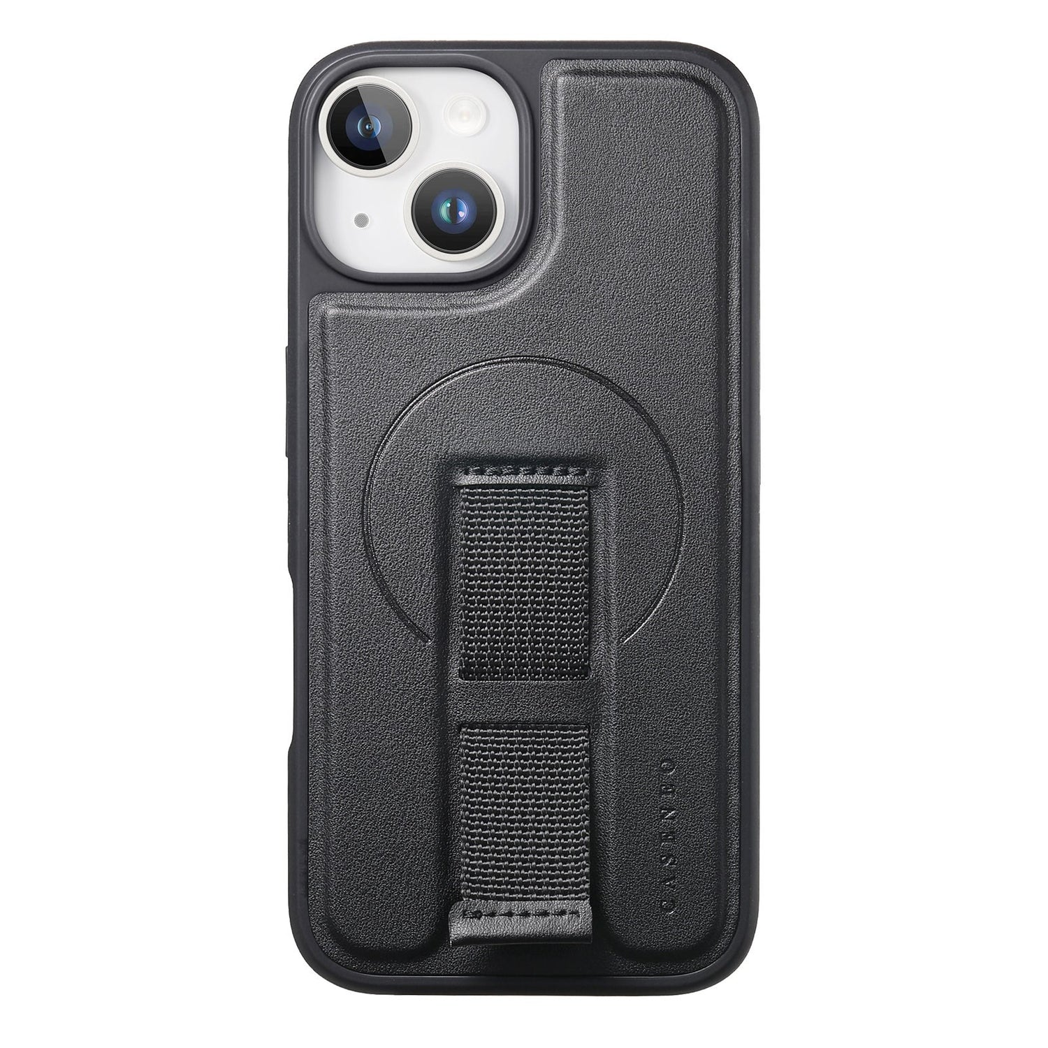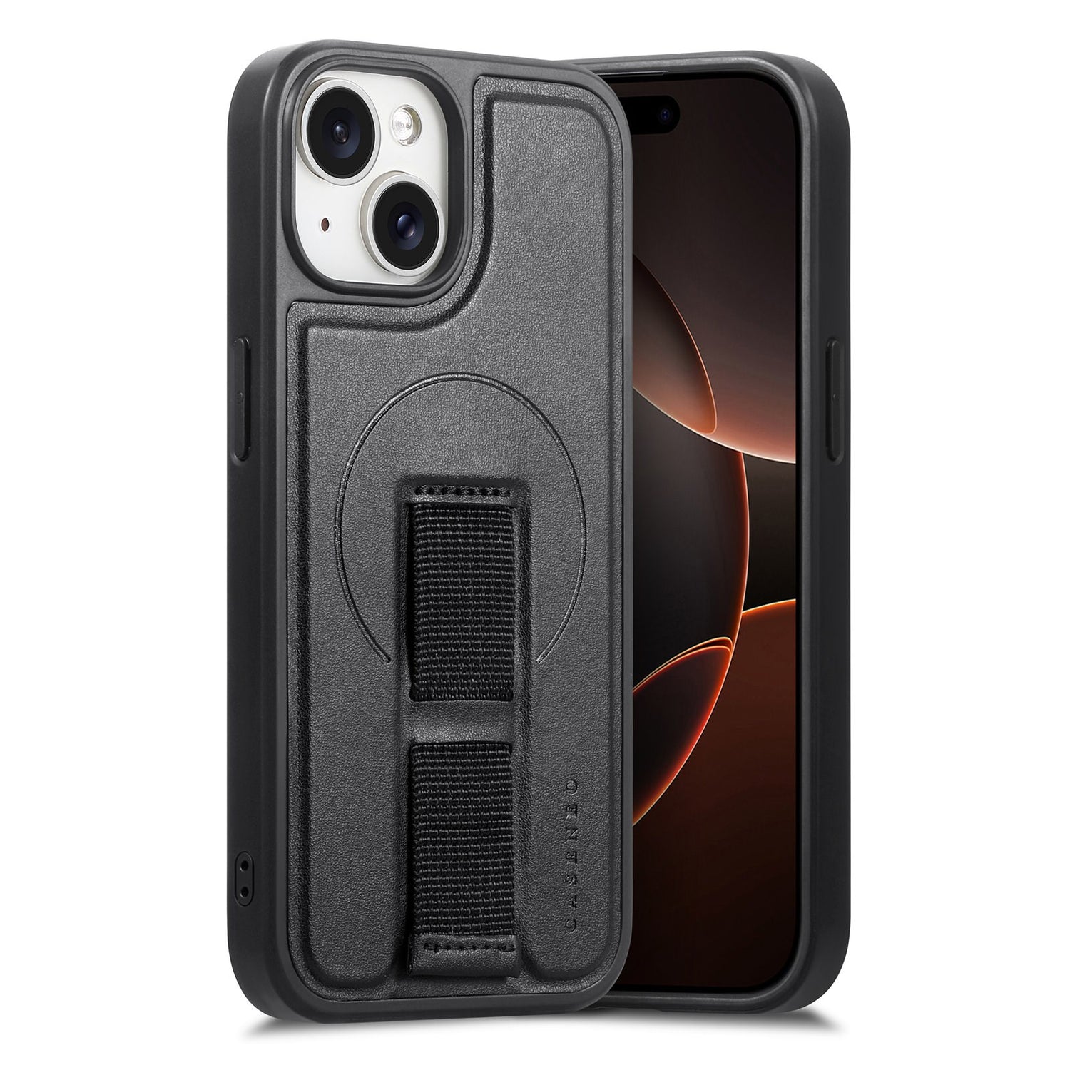 iPhone 14 / 13 - Hårdt Plastik Cover m. Kunstlæder Bagside & Fingerrem - MagSafe Kompatibel - Sort