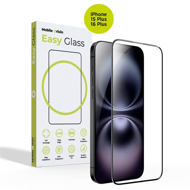 iPhone 15 Plus / 16 Plus Mobile Origin EasyGlass Beskyttelsesglas - Gennemsigtig / Sort Kant