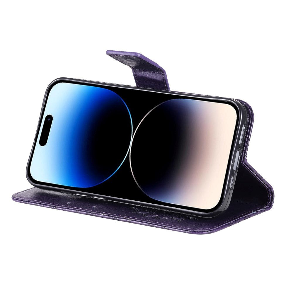 iPhone 15 Pro Læder Flip Mobil m. Pung og Strop - Mandala Blomst - Lilla