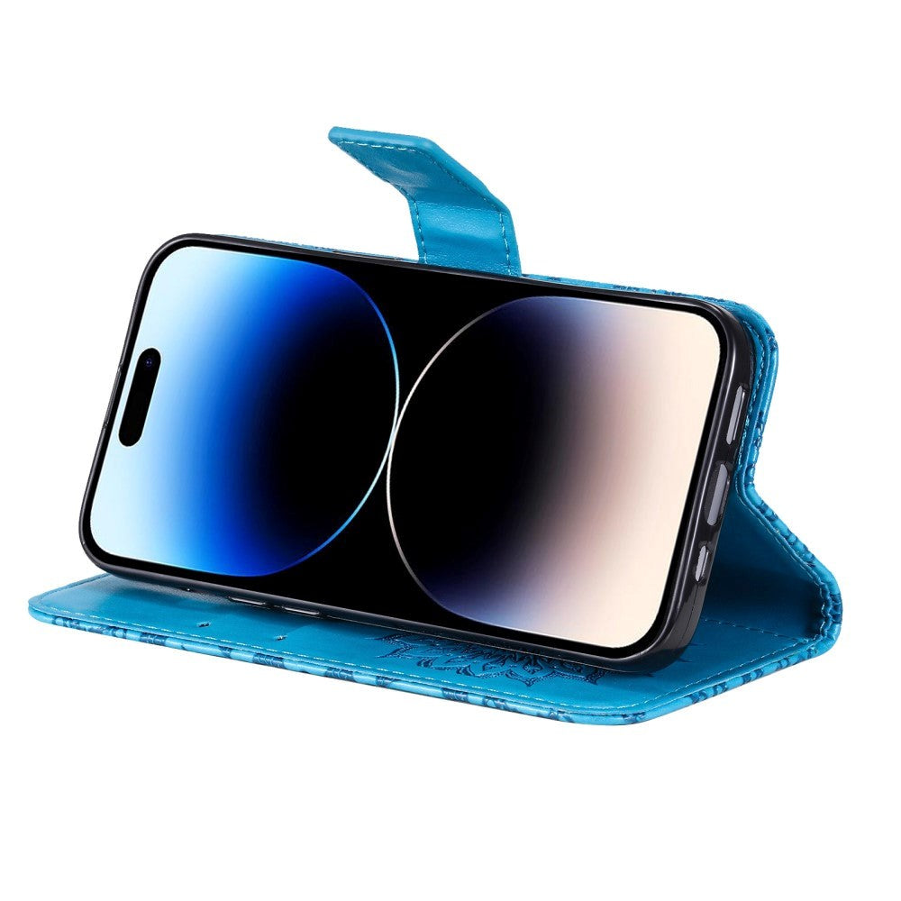 iPhone 15 Pro Læder Mobil Cover m. Pung og Strop - Mandala Blomst - Blå
