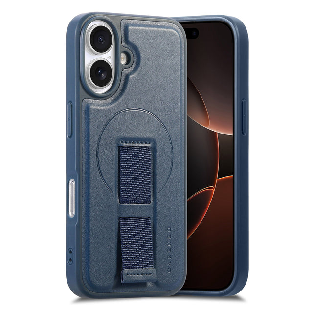 iPhone 16 - Hårdt Plastik Cover m. Kunstlæder Bagside & Fingerrem - MagSafe Kompatibel - Blå