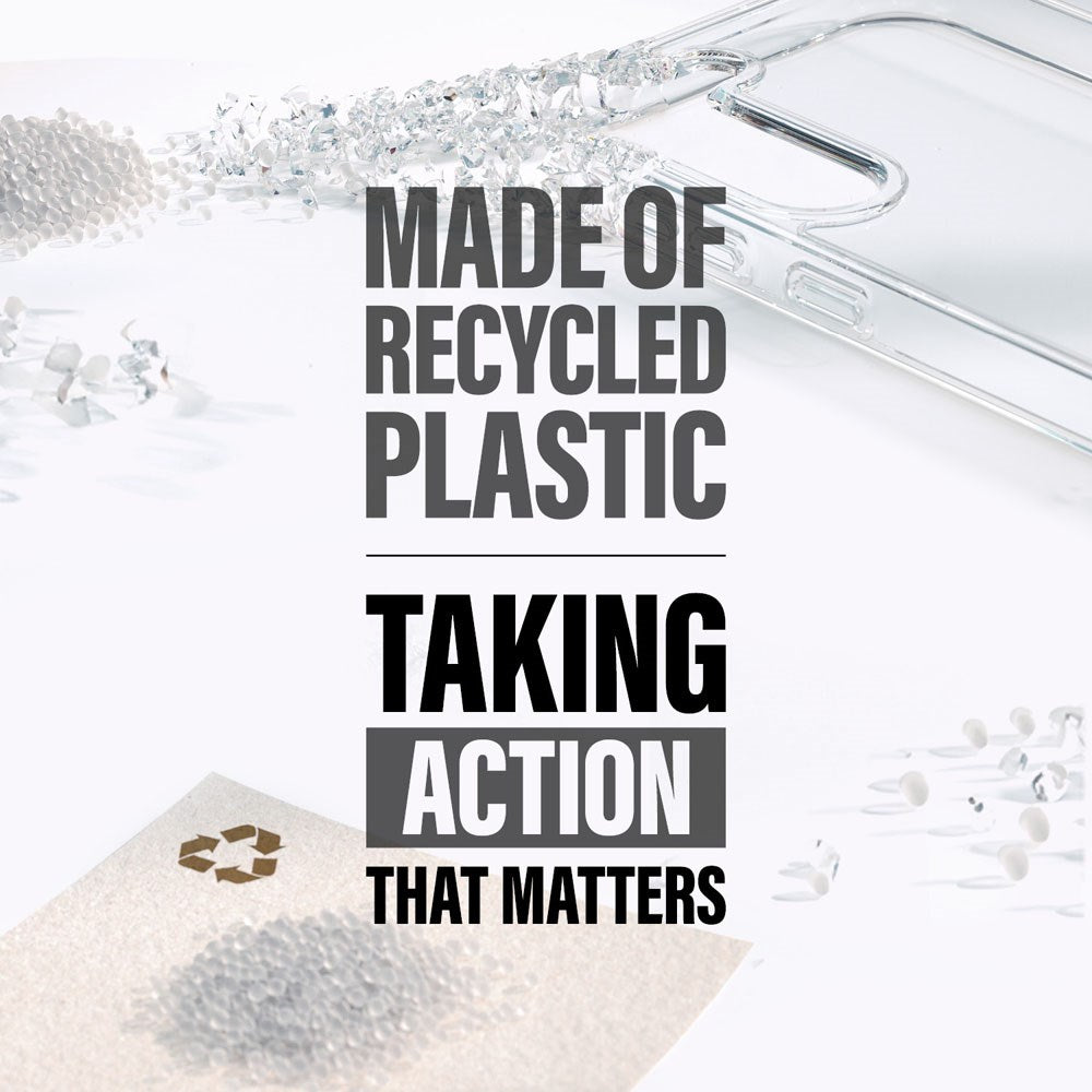 Coveret er fremstillet af 100% genanvendeligt plast og har åbninger til højttaler, kamera, blitz og oplader, så det ikke behøver fjernes ved opladning.