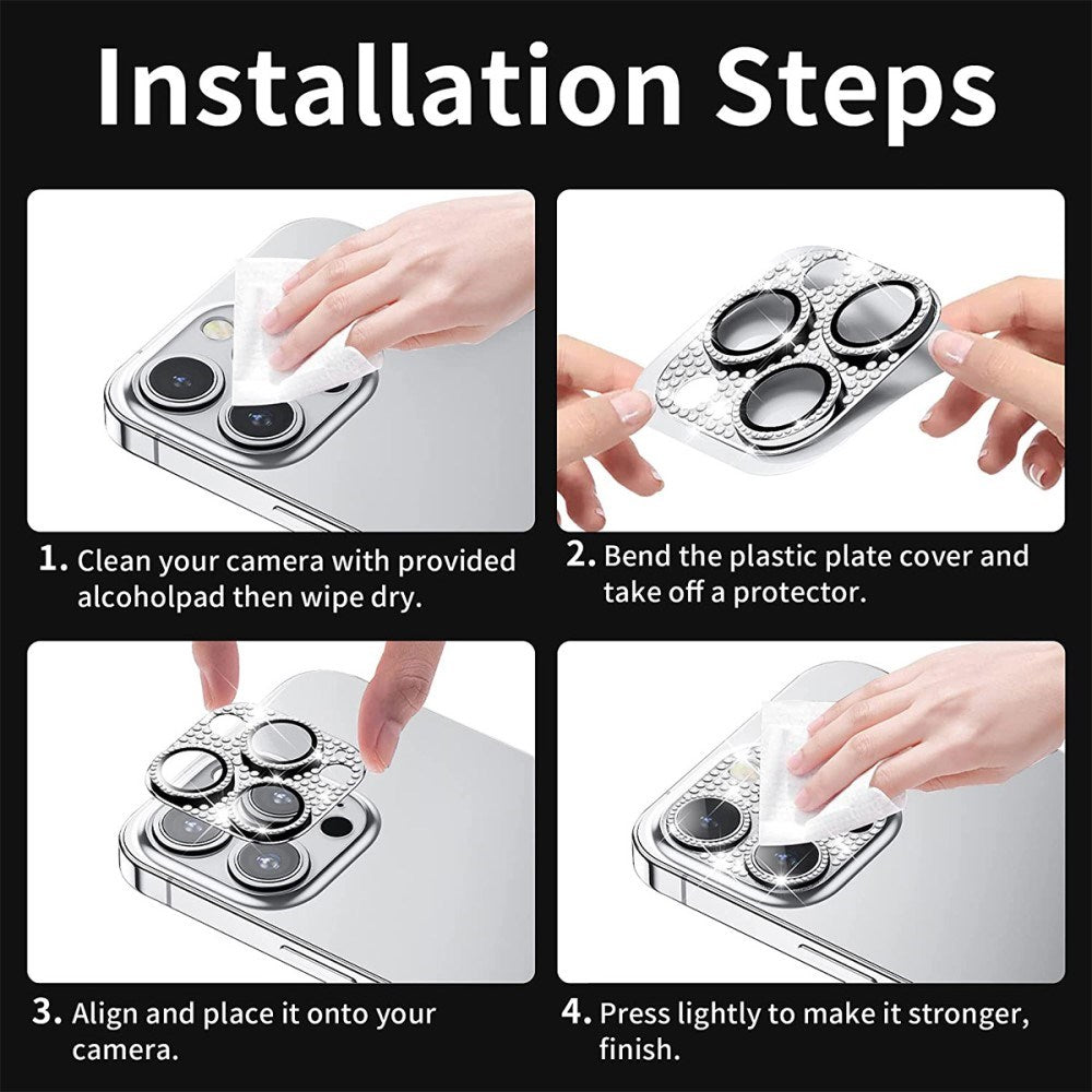 Beskyt din iPhone 16 Pro / 16 Pro Max kameralinse med dette beskyttelsesglas. Lavet af plastik og glas med et flot rhinsten design, det sikrer mod ridser og skader.