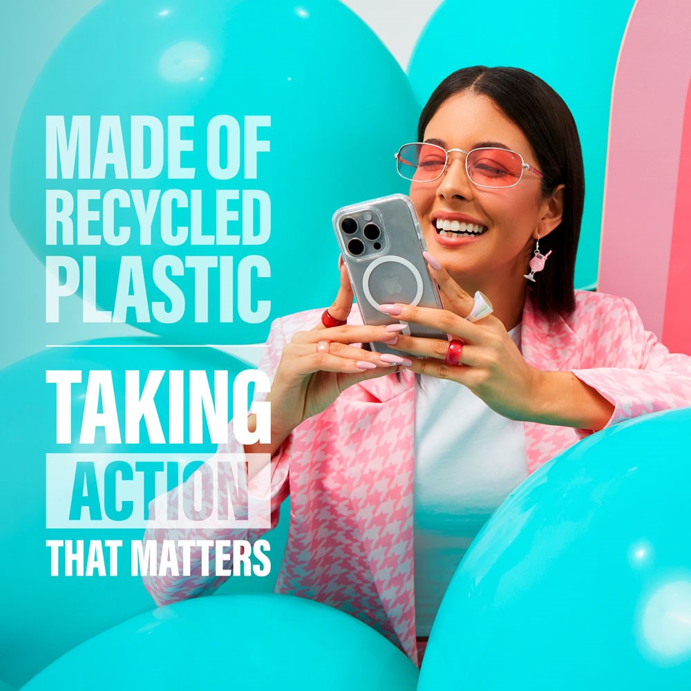 Coveret er fremstillet af 100% genanvendeligt plast og har åbninger til højttaler, kamera, blitz og oplader, så det ikke behøver fjernes ved opladning.