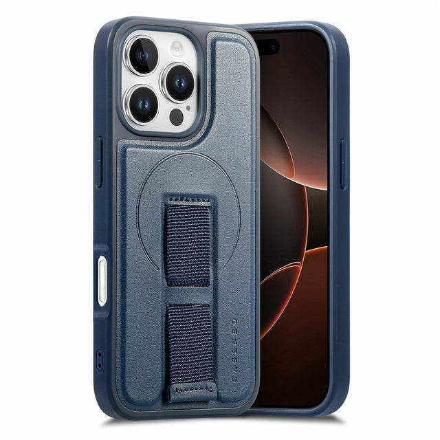 iPhone 16 Pro - Hårdt Plastik Cover m. Kunstlæder Bagside & Fingerrem - MagSafe Kompatibel - Blå