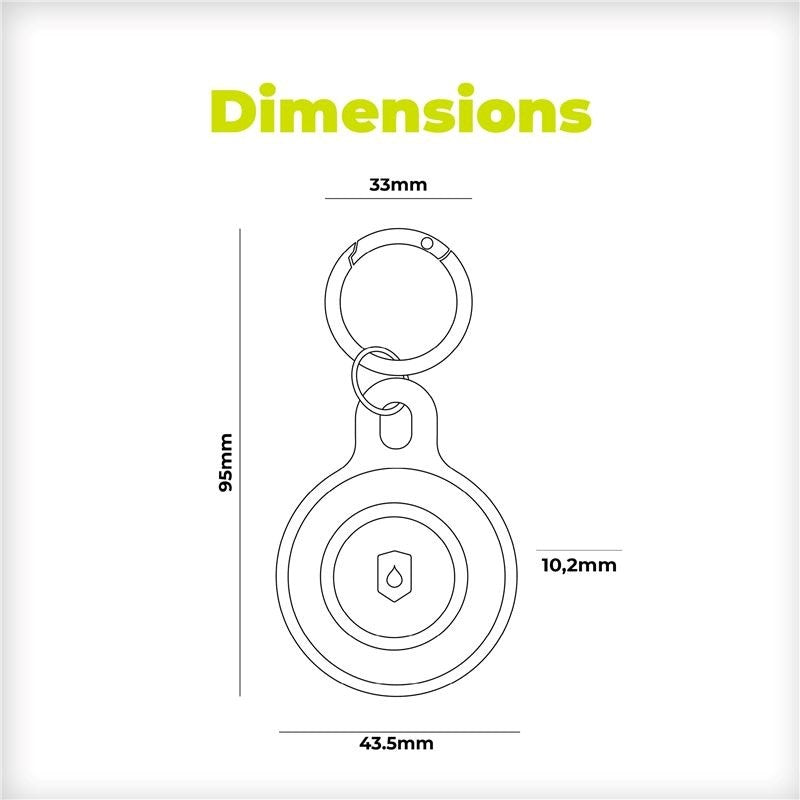 Med en praktisk metal nøglering kan holderen hurtigt fastgøres på nøgler, tasker eller andre ting, du gerne vil holde styr på. Holderen er vand- og støvafvisende, og den stødabsorberende silikone sikrer 360° beskyttelse og reducerer risikoen for skader ved tab. Hvis holderen bliver beskidt, kan den nemt rengøres ved at tørres af eller skylles (uden AirTag i).