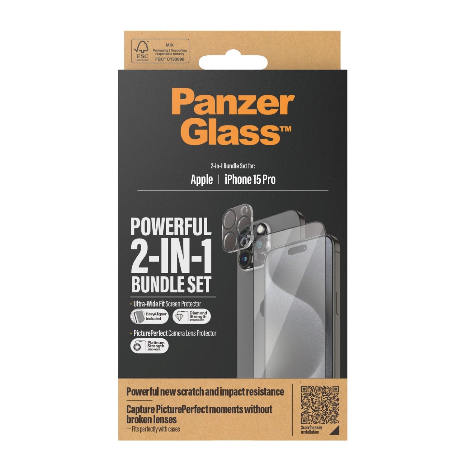 PanzerGlass iPhone 15 Pro 2-i-1 Bundle m. EasyAligner - Skærmbeskyttelse / Kamerabeskyttelse - Gennemsigtig / Sort