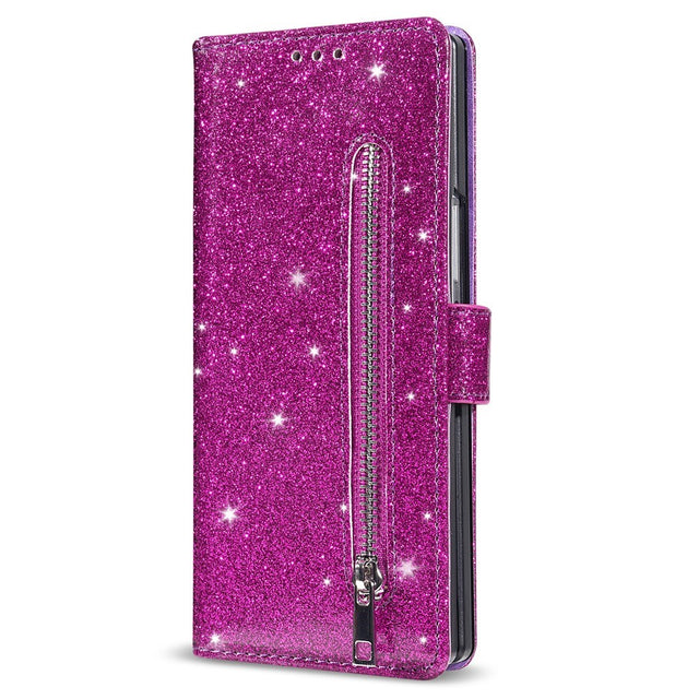 Det glitrende design giver et elegant udtryk, mens kortlommer, kontantrum og en lynlåslomme sikrer, at dine vigtigste ejendele altid er samlet. Coveret kan desuden foldes til et stativ for håndfri visning, og den magnetiske lukning samt hævede kanter beskytter telefon og kamera optimalt.