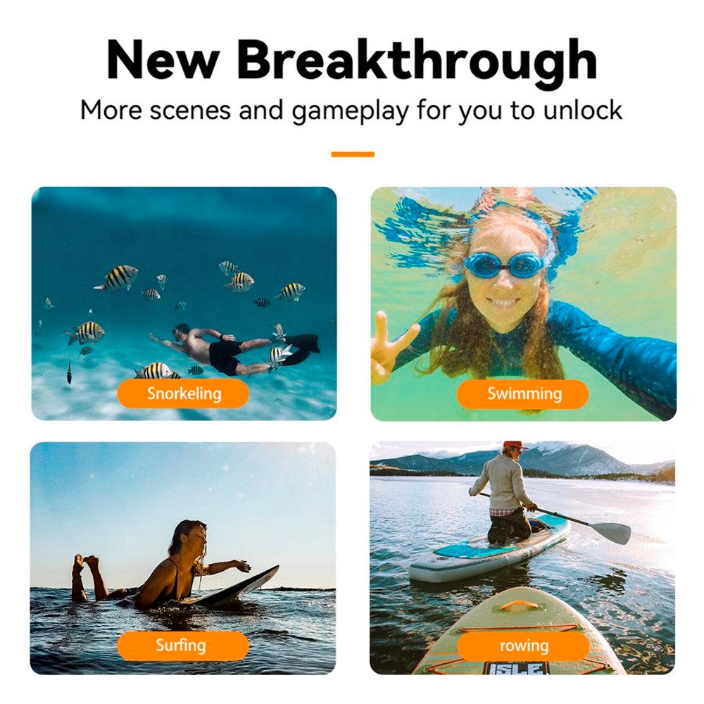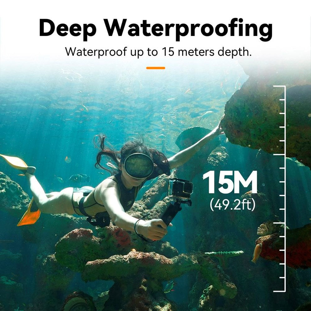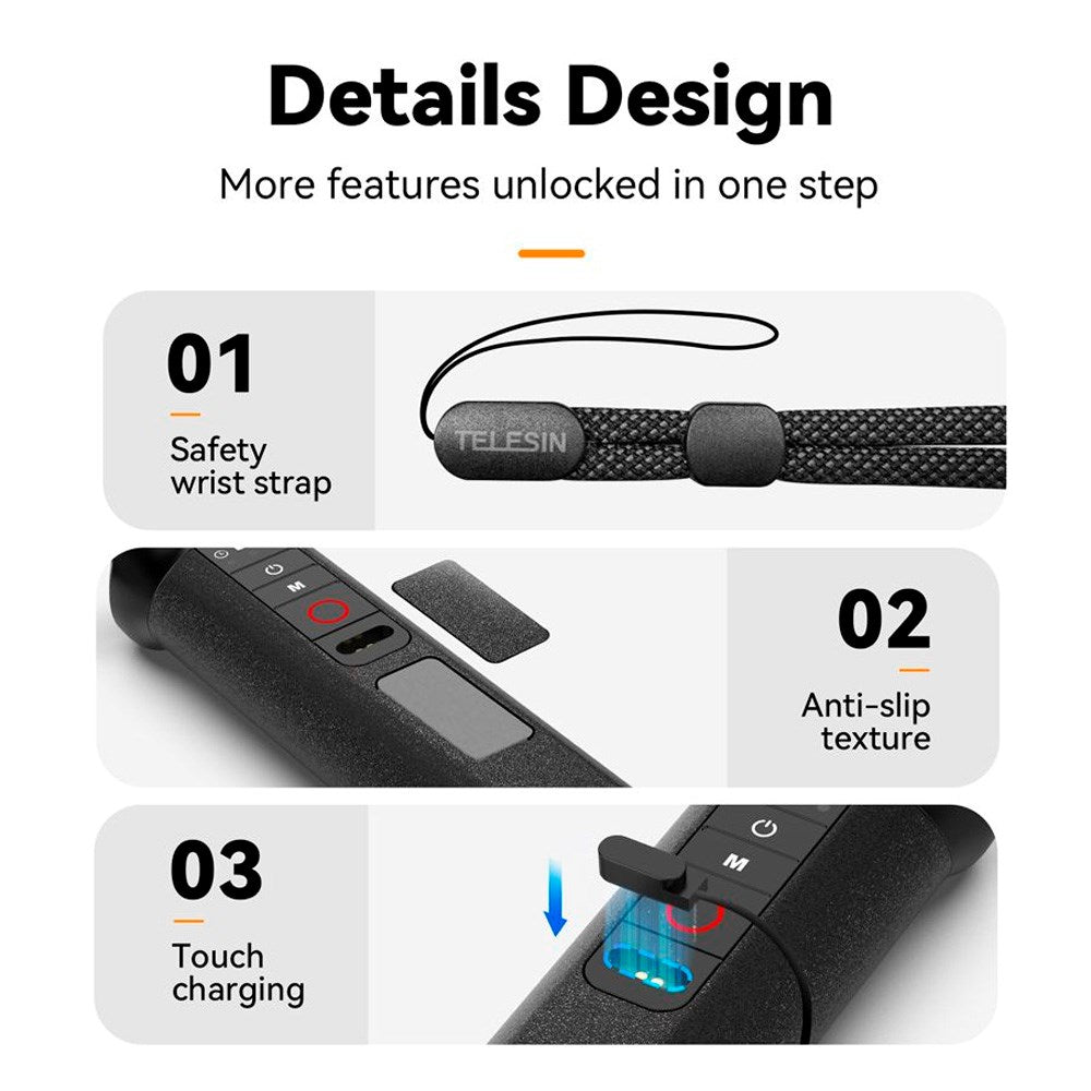 TELESIN Flydende Hand Grip Fjernbetjening til GoPro Hero 8 / 9 / 10 / 11 / 12 / 13 kombinerer sikkerhed og funktionalitet i ét smart design. Det flydende greb holder dit kamera på overfladen, mens den trådløse fjernbetjening giver dig fuld kontrol ned til 15 meters dybde.