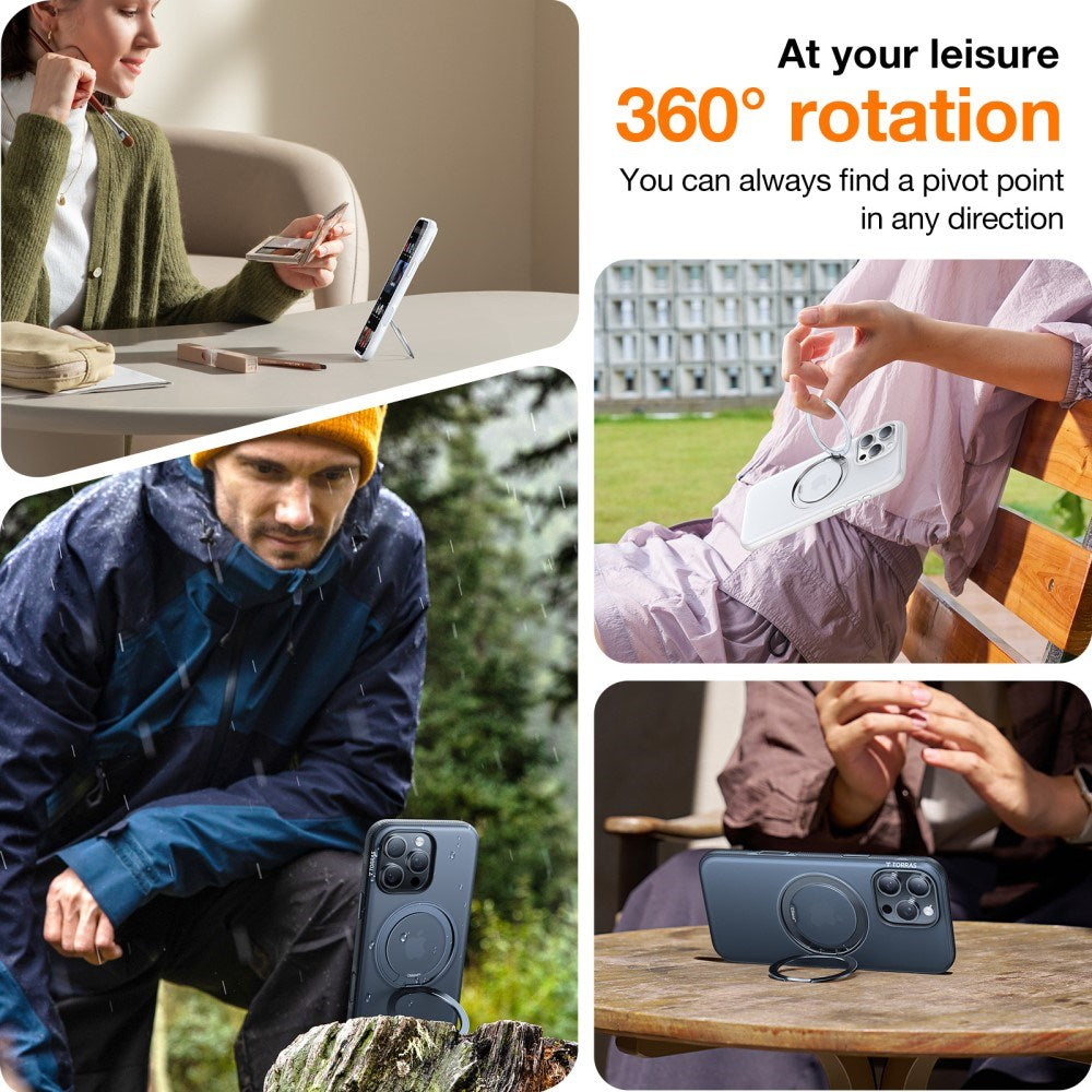 Coveret har en indbygget magnetisk ring, som gør det fuldt MagSafe-kompatibelt og fungerer som en 360° kickstand til håndfri visning.